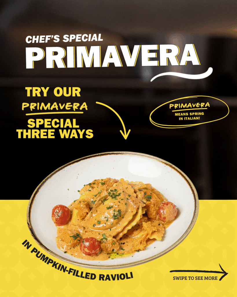 Celebrate spring with Gnocchi Gnocchi Brothers’ limited-edition Primavera menu. Enjoy a creamy dish topped with crispy bacon, semi-dried tomato, and fresh parsley — the perfect flavour combination served on your choice of Pumpkin Ravioli, Gnocchi, or Spaghetti. Available for a limited time when you dine in at Gnocchi Gnocchi Brothers. Book to dine in here.